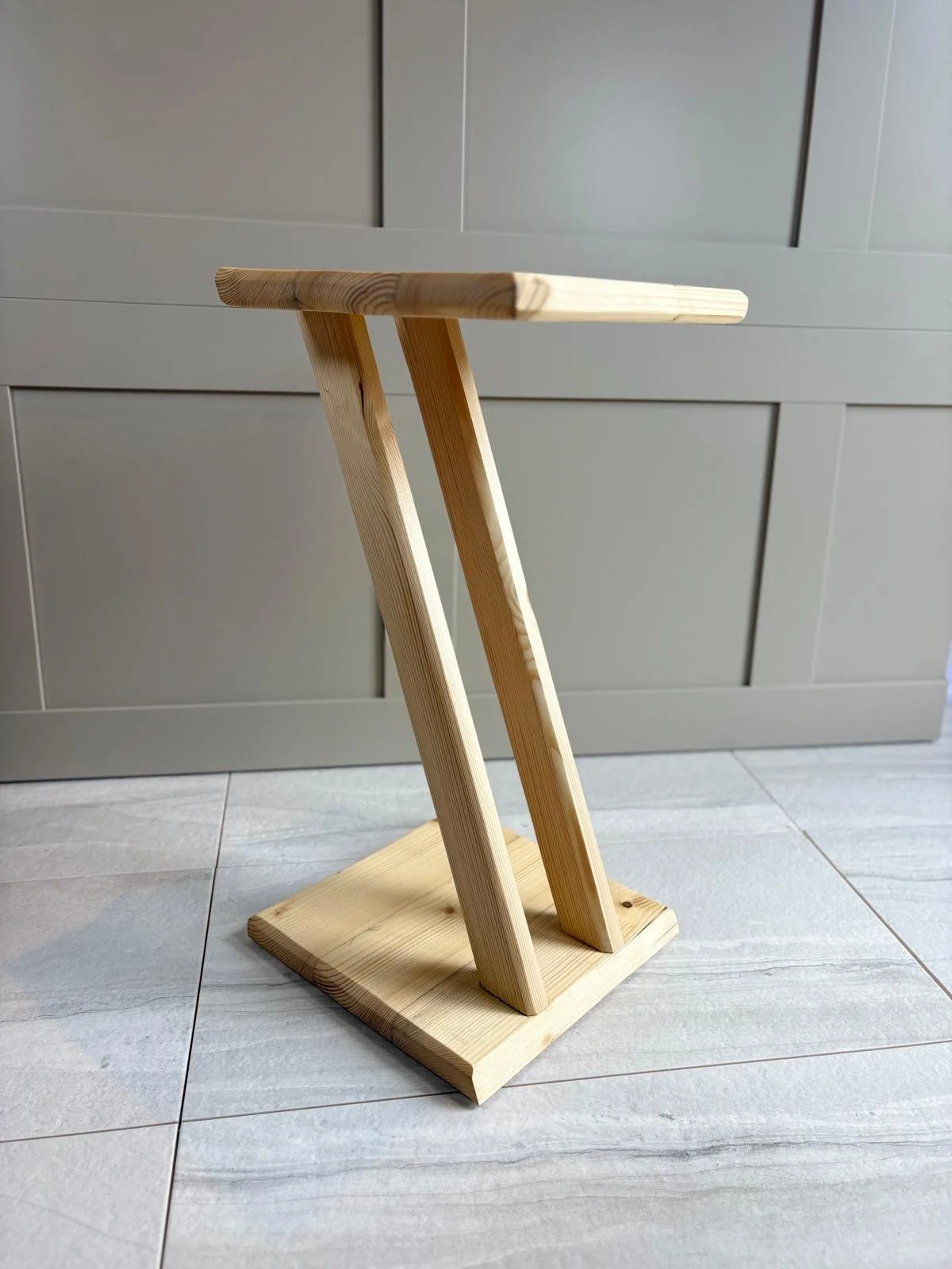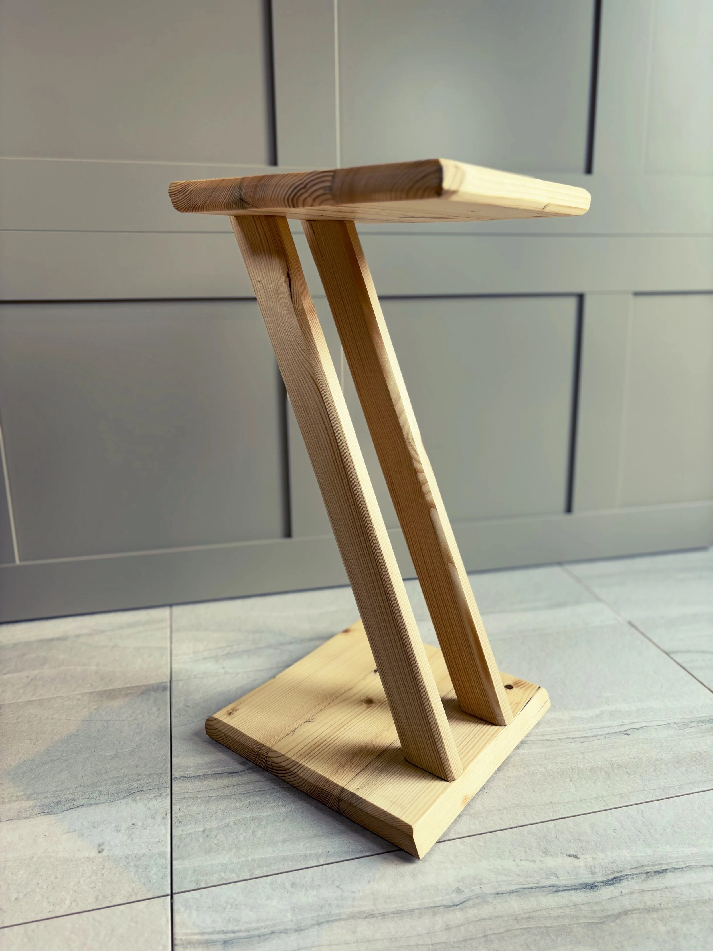 This unusual design has the dual function of being a table and somewhere to rest a book. The nakedness of the pine shows the character of its former life and highlights the ‘Z’ shaped design.